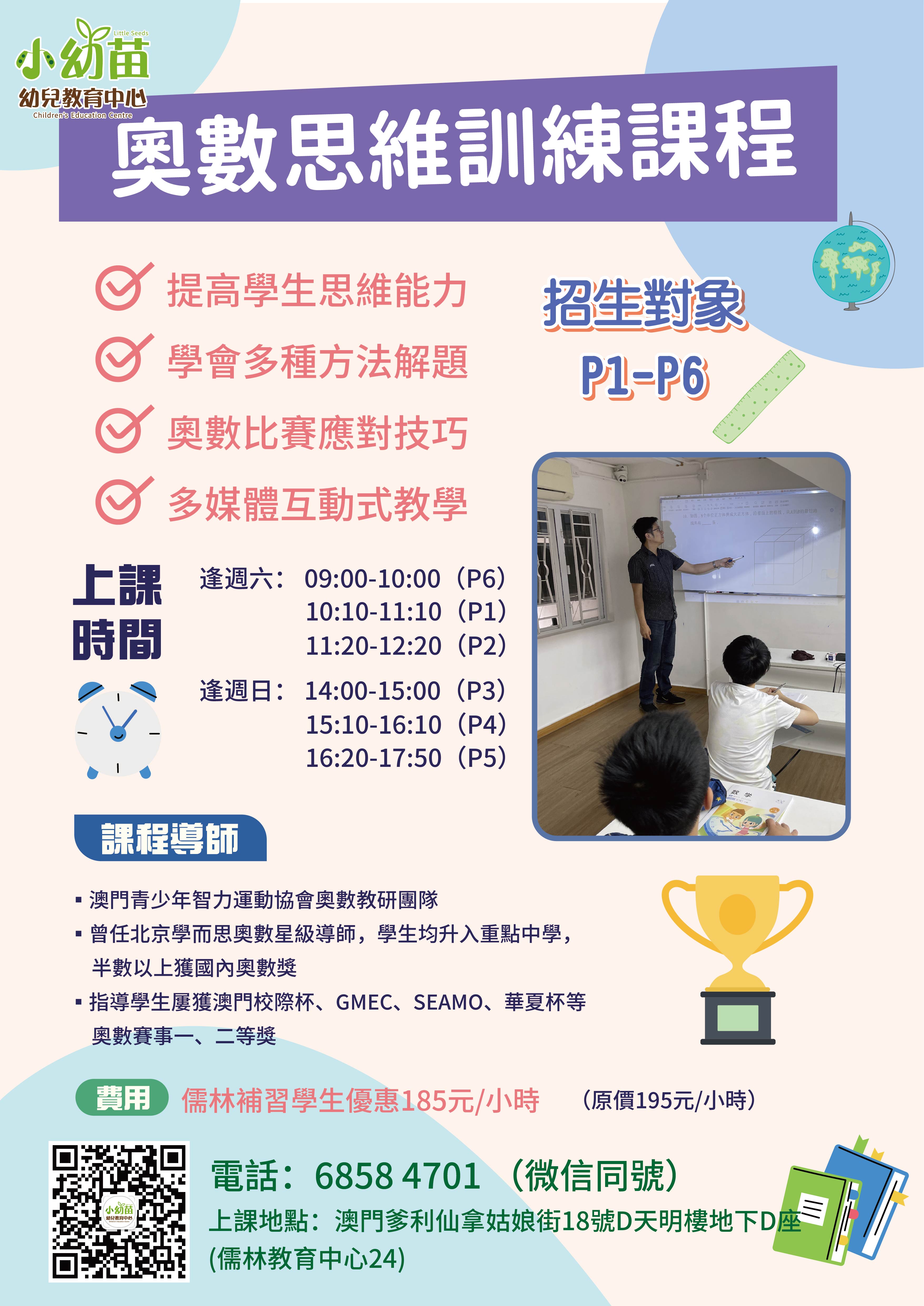 為了激發小朋友對🔢數學的興趣,培養他們的數學天賦和解決問題的能力,我們精心打造「奧數思維訓練課程」,歡迎👧P1-P6學生加入充滿😀樂趣與💪挑戰的數學探索之旅!成績優異學生將被舉薦參加各類國際奧數比賽!